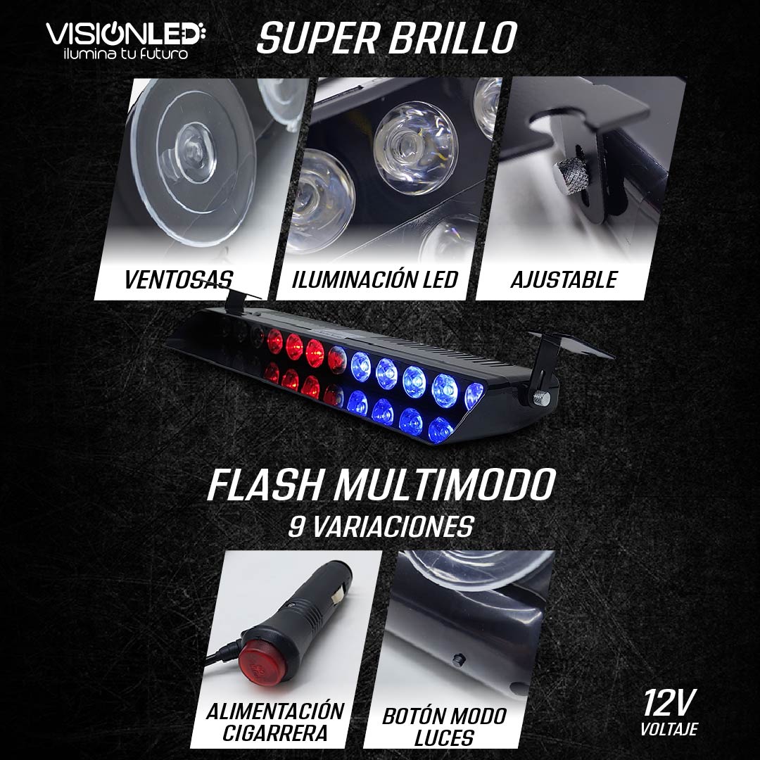 Cuenta con 9 modos de flash multimodo, que pueden cambiarse fácilmente mediante su botón de control integrado, permitiendo adaptar la señalización según la necesidad. Funciona a 12V y se alimenta directamente desde el encendedor del vehículo, lo que facilita una instalación rápida y sin modificaciones eléctricas.