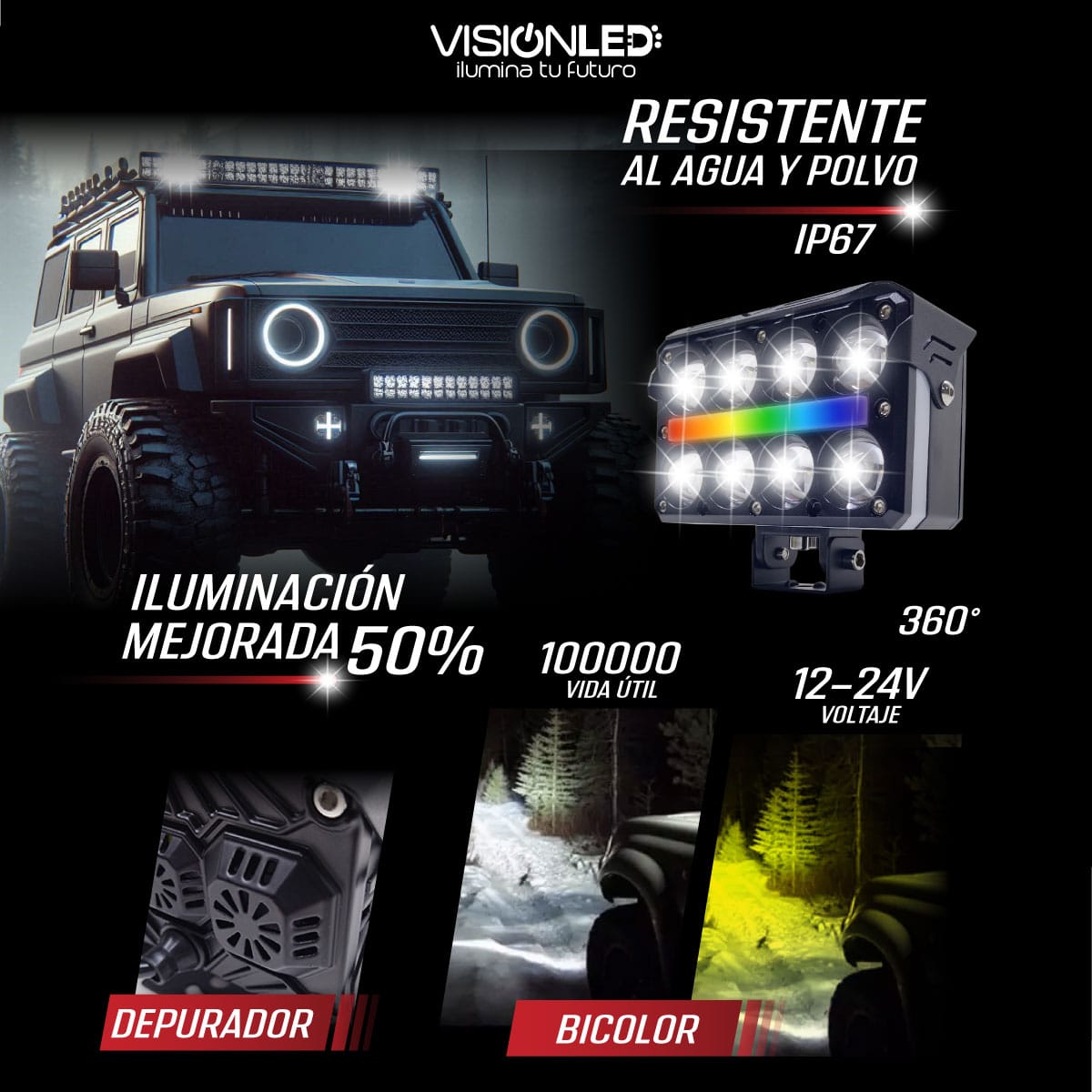 Exploradoras 8 Lupas RGB de alta potencia con iluminación mejorada 50%, sistema bicolor, protección IP67 y compatibilidad 12V–24V. Diseño resistente en aleación de aluminio con soporte 360°. Ideal para 4×4 y trabajo pesado.