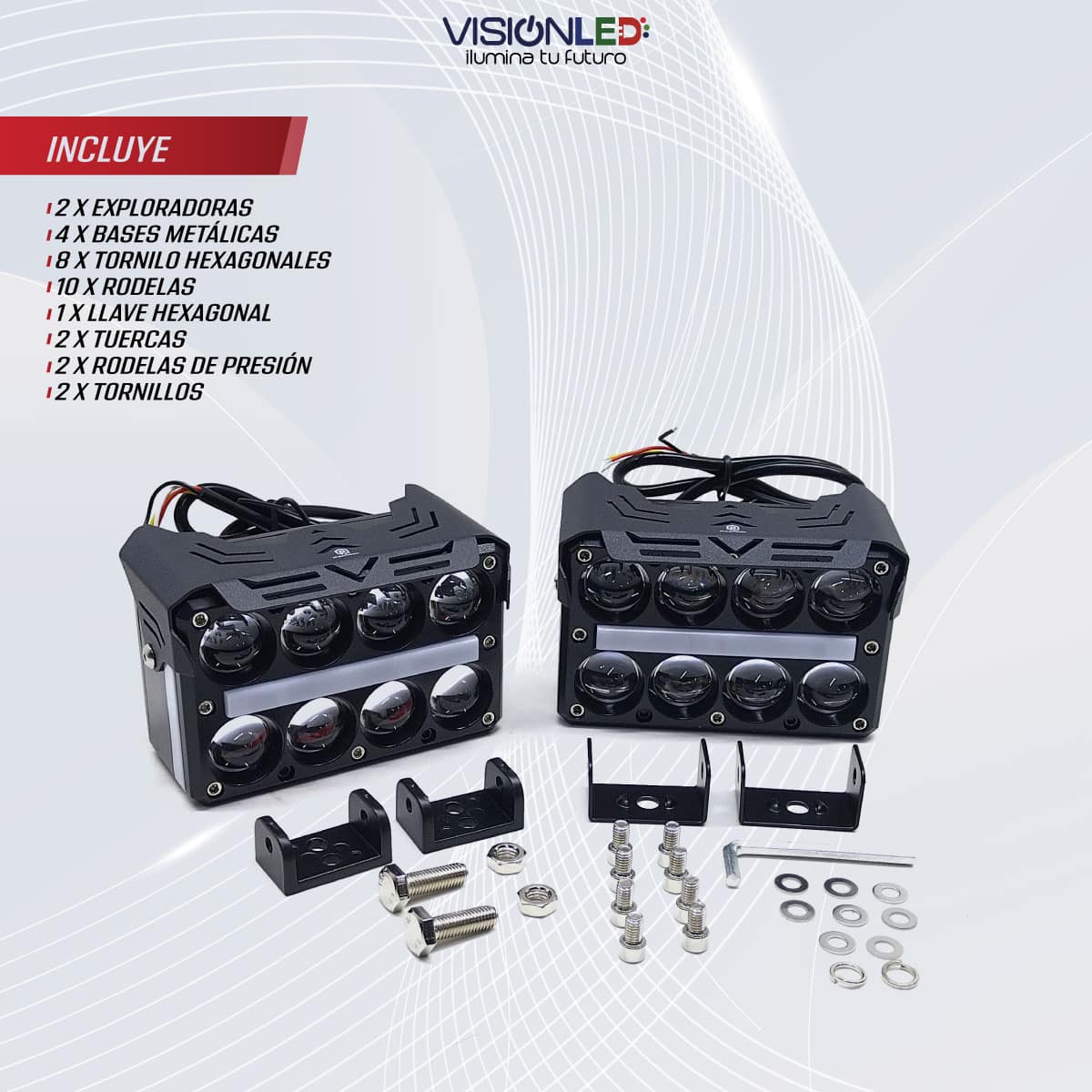 Incluye 2 exploradoras, bases metálicas, tornillos hexagonales, rodelas, llave hexagonal y accesorios necesarios para instalación inmediata.